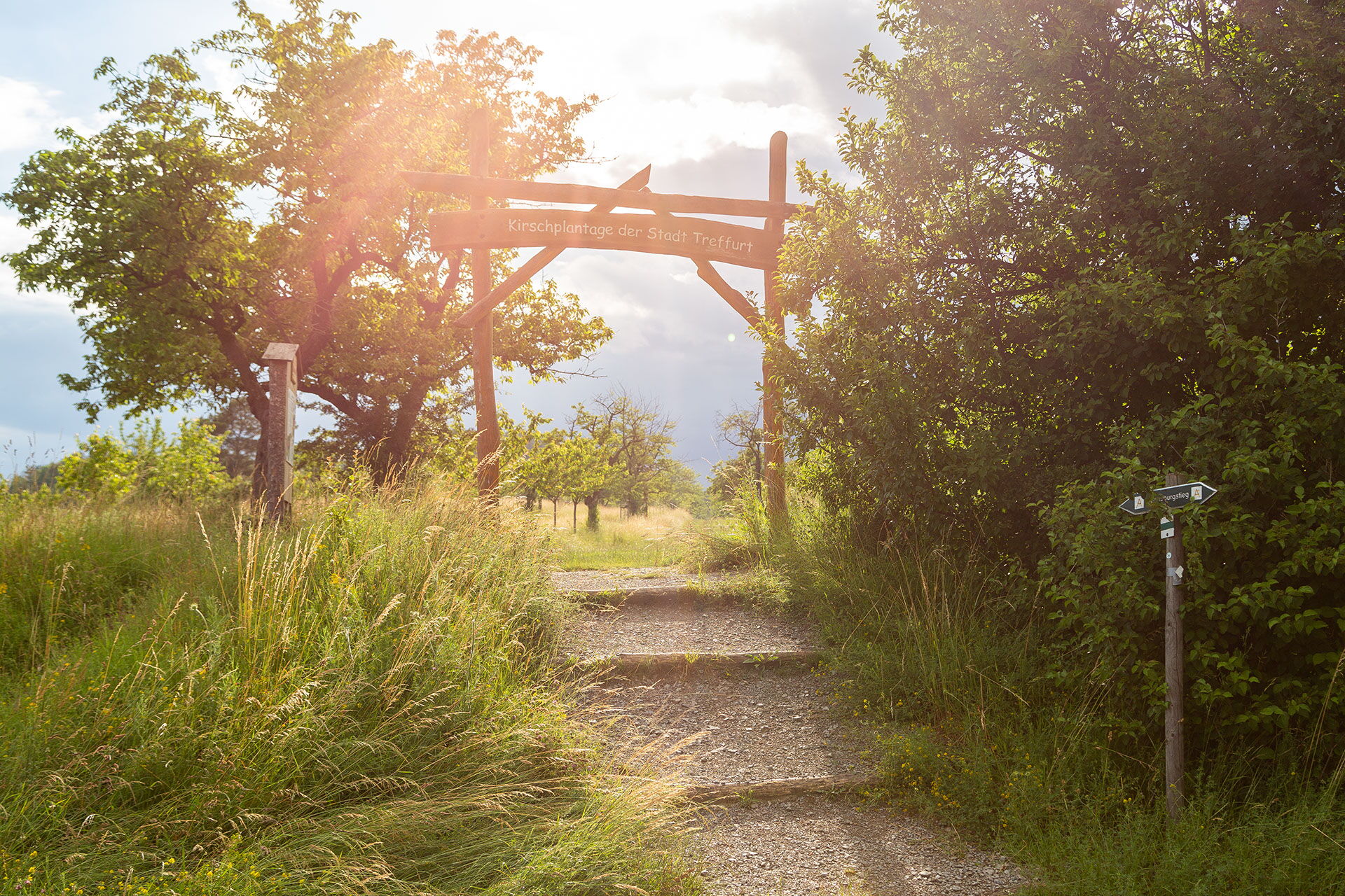 Dass der Obstbau in Treffurt heimisch wurde, liegt wohl in den guten geologischen und klimatischen Bedingungen begründet. Ca. 25.000 Obstbäume standen einst in der Gemarkung der Werrastadt. Schon 1788 wurde angeordnet, „dass jeder neu eingezogene Einwohner und jeder junge Ehemann 6 Stück gepfropfte Obstbäume...“ und „jeder Einwohner jährlich 2 Stück...“ pflanzen musste. Auch der Treffurter Spitzname „Sperrachen“ (nach einem Regen geplatzte Kirschen) geht wohl auf die hiesigen Obstbauern zurück. Brautpaare bekommen heute von der Stadt Kirschbäumchen geschenkt, die zur Erhaltung der Plantage hier gepflanzt werden.