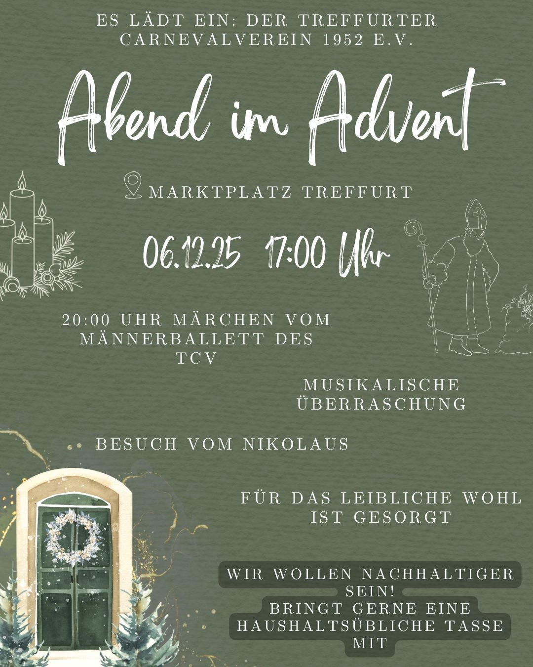 Der Treffurter Carneval Verein 1952 e.V. lädt herzlich zum „Abend im Advent“ am Samstag, den 06. Dezember 2025, auf den Marktplatz in Treffurt ein.