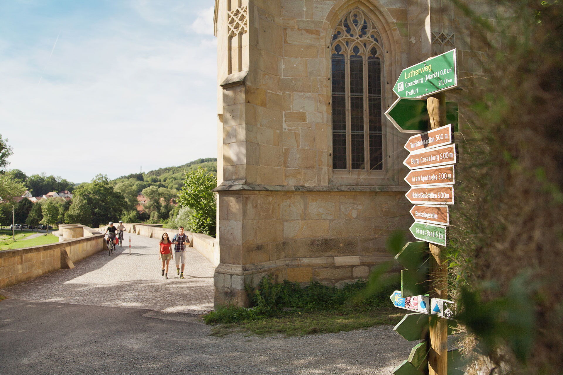 Auf dem Abschnitt des Lutherweges in Richtung Treffurt trifft man in Hörschel auf den Beginn des bekannten Höhenwanderweges Rennsteig, pausiert im Stiftsgut Wilhelmsglücksbrunn mit Cafe´ und Hofladen und gelangt schließlich über die im Jahr 1223 erbaute Werrabrücke und an der Liboriuskapelle vorbei nach Creuzburg. Die gleichnamige Burg war beliebter Aufenthaltsort der heiligen Elisabeth, die hier von 1223 bis 1228 lebte und ihren beiden Kindern Hermann und Gertrud das Leben schenkte.